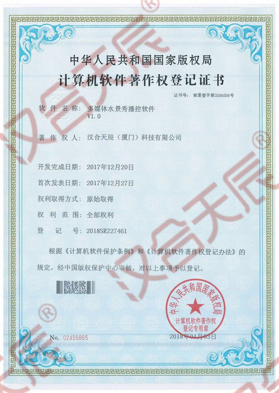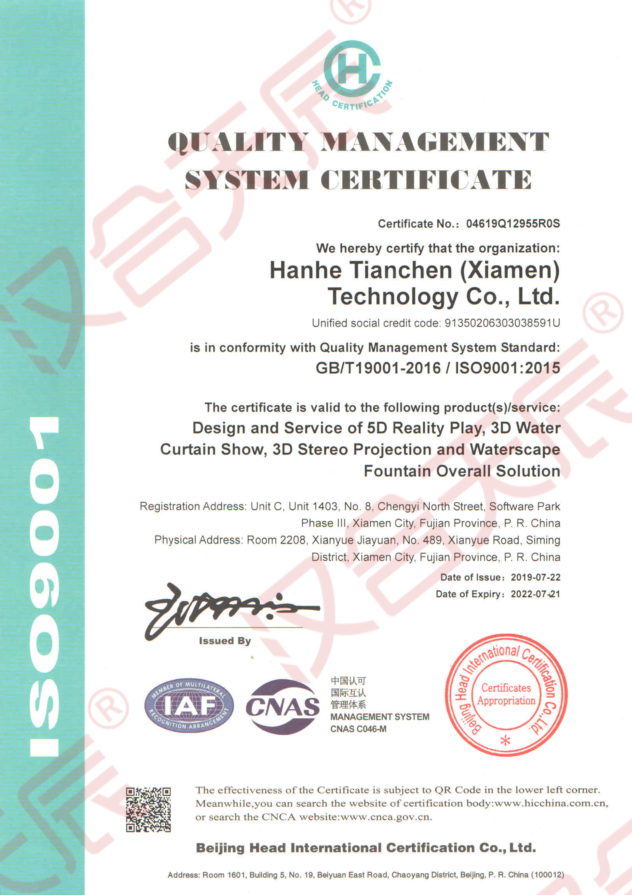 The company successfully created the zunyi 5D live-action drama "zundaoxingyi" which set a guinness world record. For the xiamen brics conference pingtan sub-venue to create the international level of large-scale water screen drama "Blue island"; For xiamen back garden - tourist resort ten mile blue mountain created "love in the blue mountain" fantasy light and shadow paradise;creating a high-level water screen light show for "world Buddhism BBS" and "world matsu BBS", which was well received by domestic and foreign guests. As a national One Belt And One Road cultural export project, We planned and produced the largest live-action drama "the essence of mountain and the essence of water" in Vietnam, which demonstrates the cultural confidence of the Chinese nation! It also marks that the top technology of Hanhe Tianchen has officially gone abroad and gone to the world!