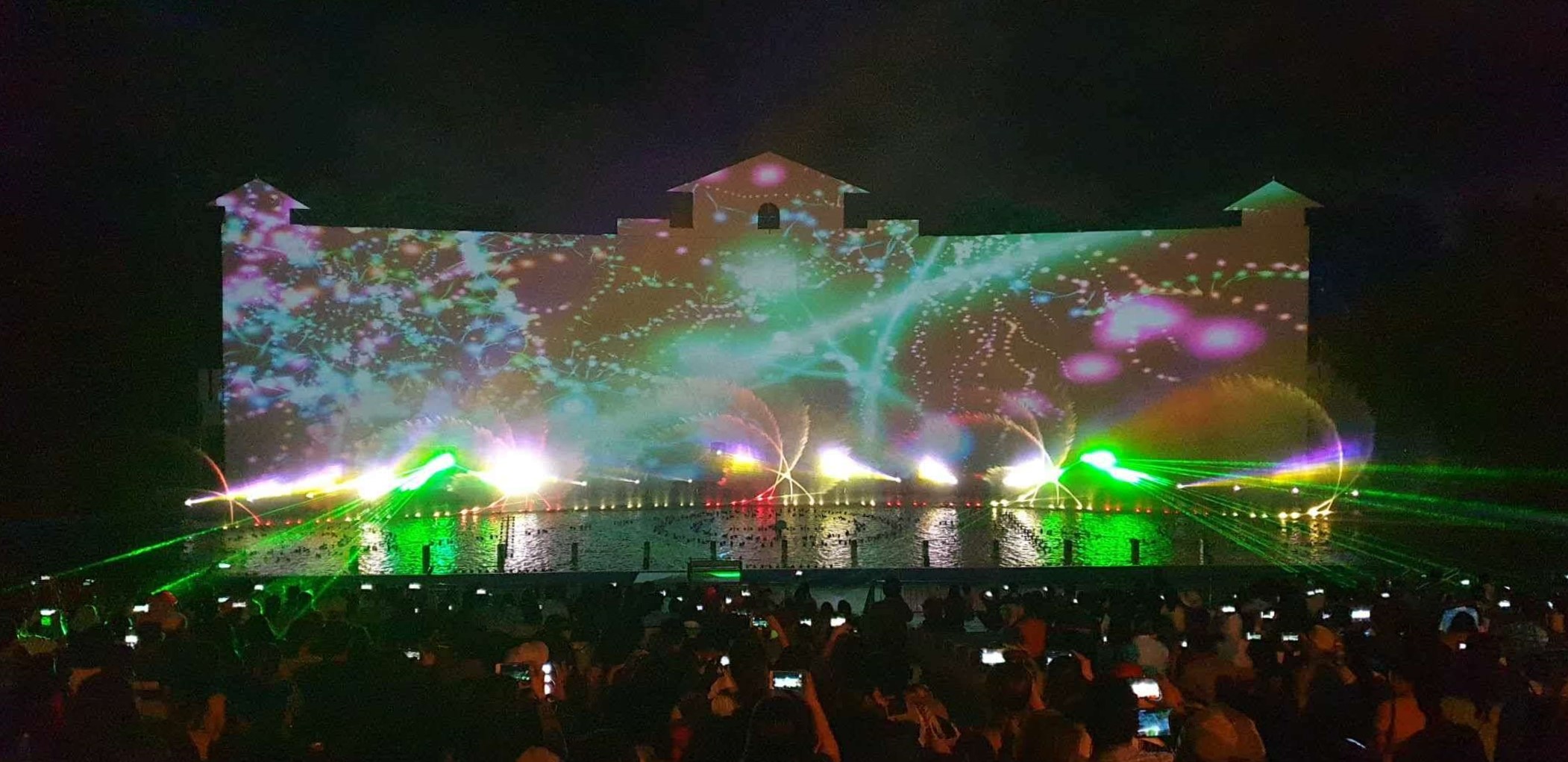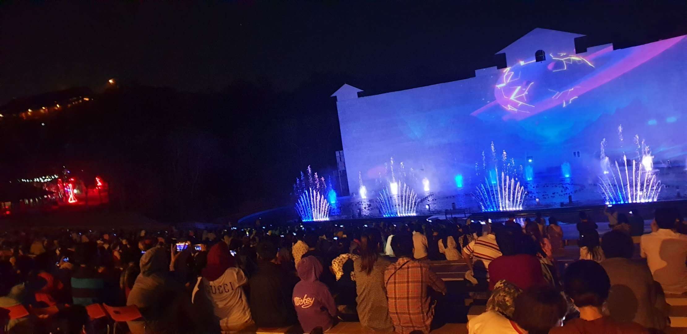 整场演出以高新科技为支撑,以神话为魂,以山水为体,再现越南神话的盛景。技术团队根据当地实际情况,设计出最科学合理的投影灯光及喷泉水型变换,以减小自然环境对演出的影响,使演出难度下降,保障每场演出都能顺利进行。作品中展现的“水火交融”的喷泉特效,极大地提升了水型的整体档次和视觉效果,体现出汉合天辰在业内技术探索道路上的领航水准!
