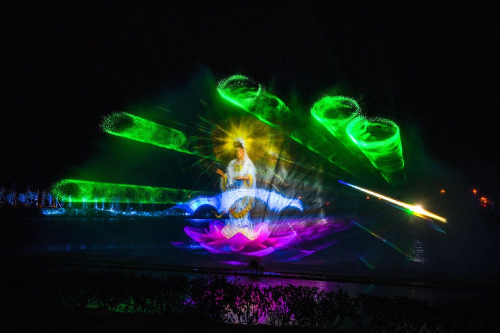 光影水舞秀融入了许多与妈祖有关的元素,用舞蹈的形式将妈祖的成长历程、济世救人、舍身为民等情节一一呈现,表现妈祖“立德、行善、大爱”的精神。表演中还有湄洲岛历史、人文和现代城市发展的画面,在声光水电的完美交融中讲述着妈祖和湄洲岛的故事。
