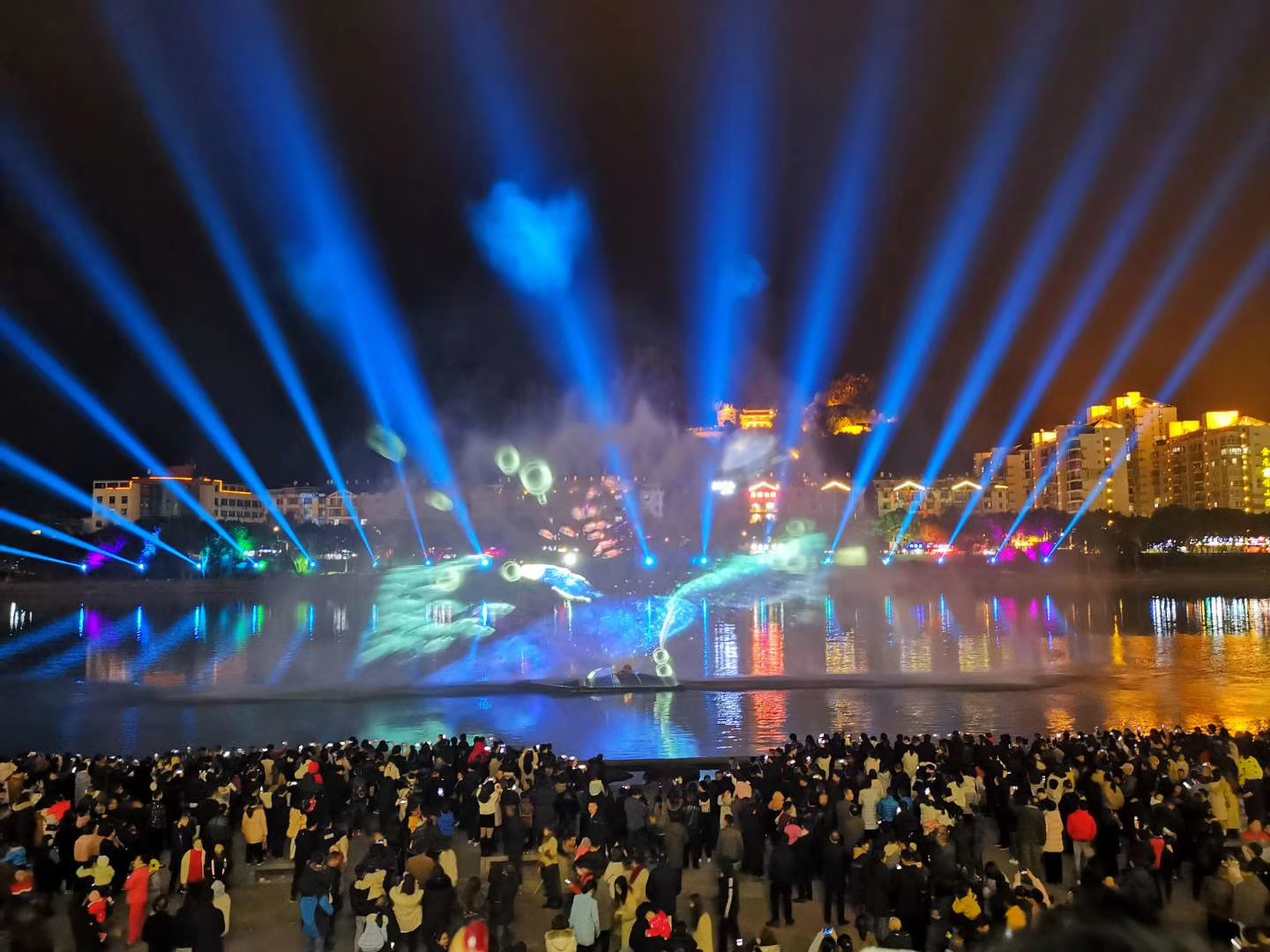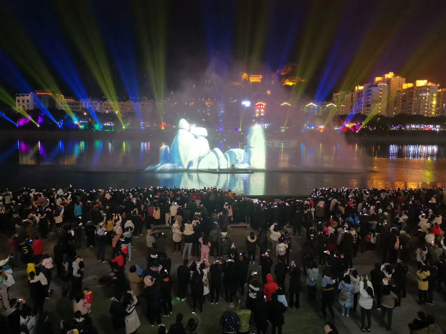 1月20日晚,裸眼3D光影水幕在桐山溪畔棋艺广场进行最终调试,吸引众多市民围观,调试现已完成。