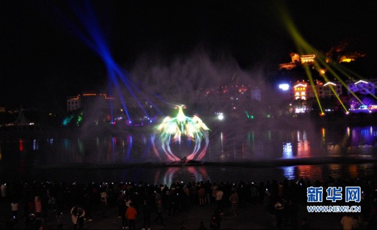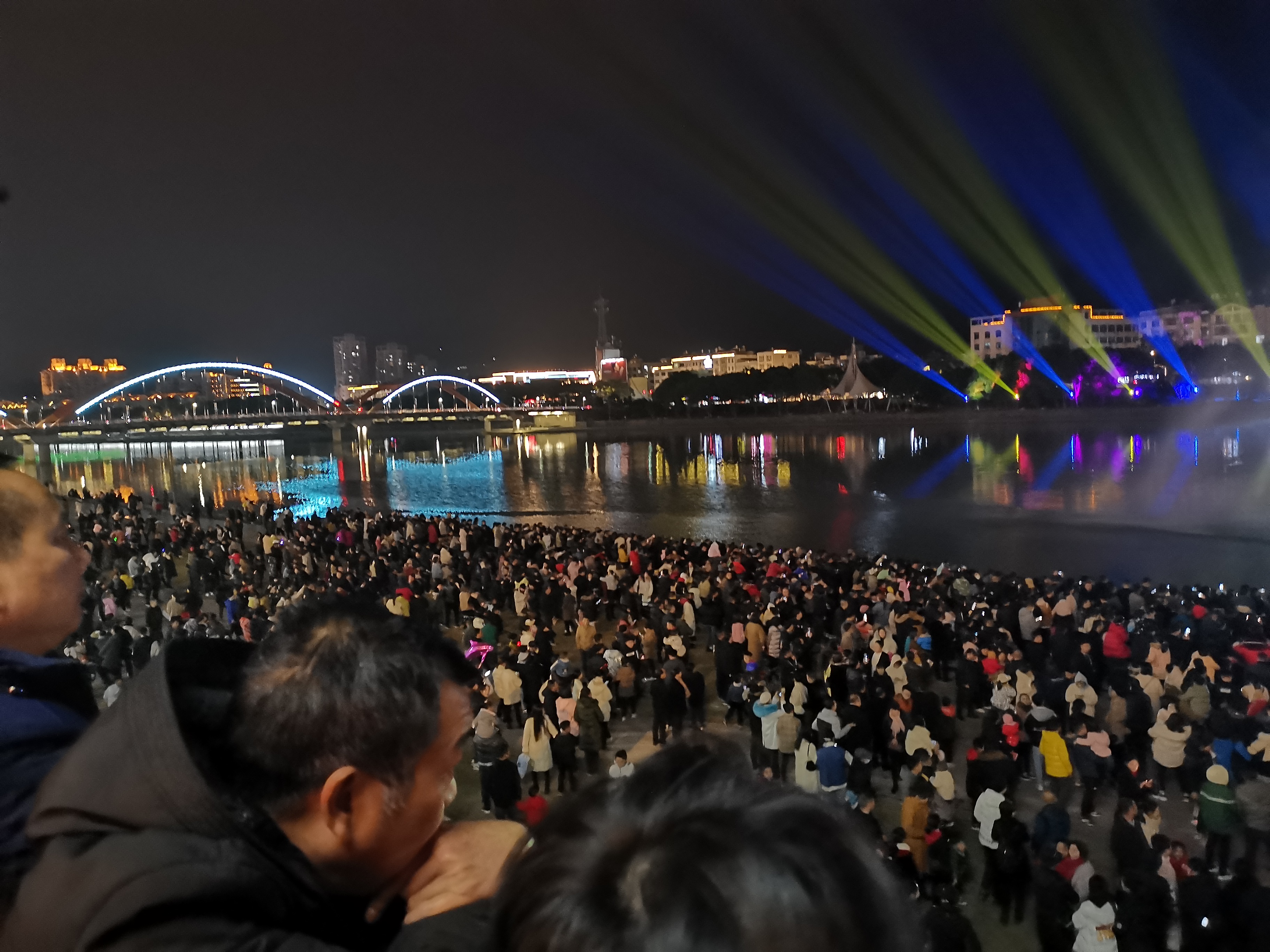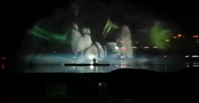 于21号晚6点半正式亮相,桐山溪岸边、桥上已是里三层、外三层,乌泱泱一片。霎时间,水柱腾空而起,在激光束的照射下,绽出绚烂的3D数字光效,让人潮顿时沸腾。