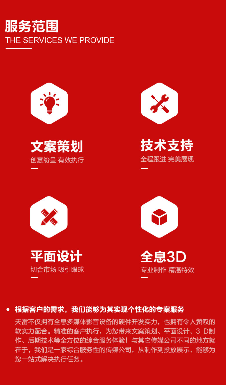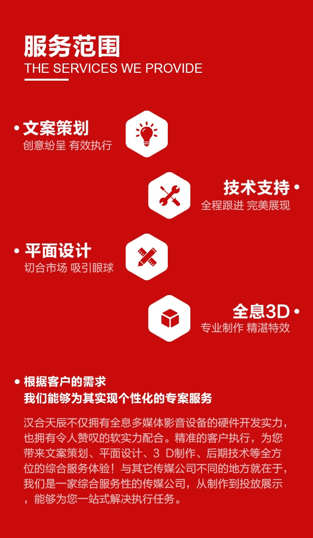 汉合天辰专注全息婚礼,全息宴会视觉创意,致力于视觉艺术,主题创意和数字技术整合及行业应用从事全息婚礼,全息宴会厅,旅游演艺,旅游景区,大型户外场所等新视觉创意服务,汉合天辰(厦门)科技有限公司,汉合天辰(厦门)科技有限公司,致力于3D video mapping、全息投影、裸眼3D技术、互动交互等新媒体技术,拥有21项自主知识产权及专利,是中国第一家将3D全息系统产品化,结合新媒体艺术,成功应用于文化旅游、实景演艺、景区灯光秀、城市亮化等行业的高科技公司。